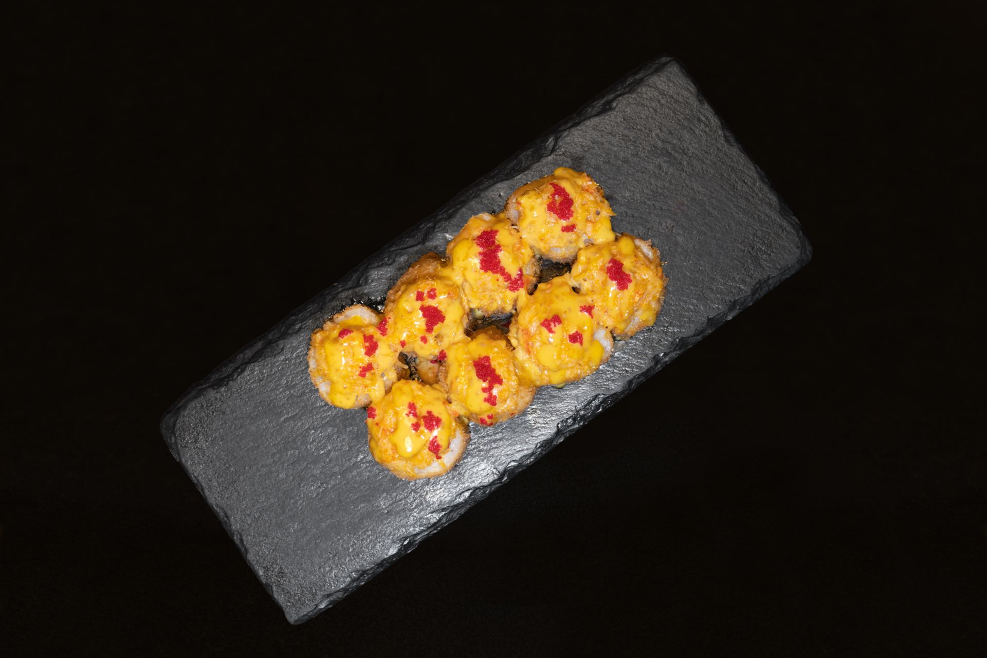 Обжаренный в панировке ролл с курицей и свежими овощами под ореховым соусом и кунжутом