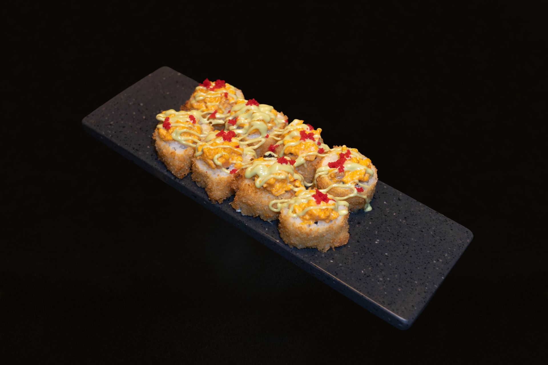 Обжаренный в панировке ролл со слабосолёной сёмгой, творожным сыром и авокадо, запечённый под соусом спайс и политый соусом васаби с добавлением икры масаго