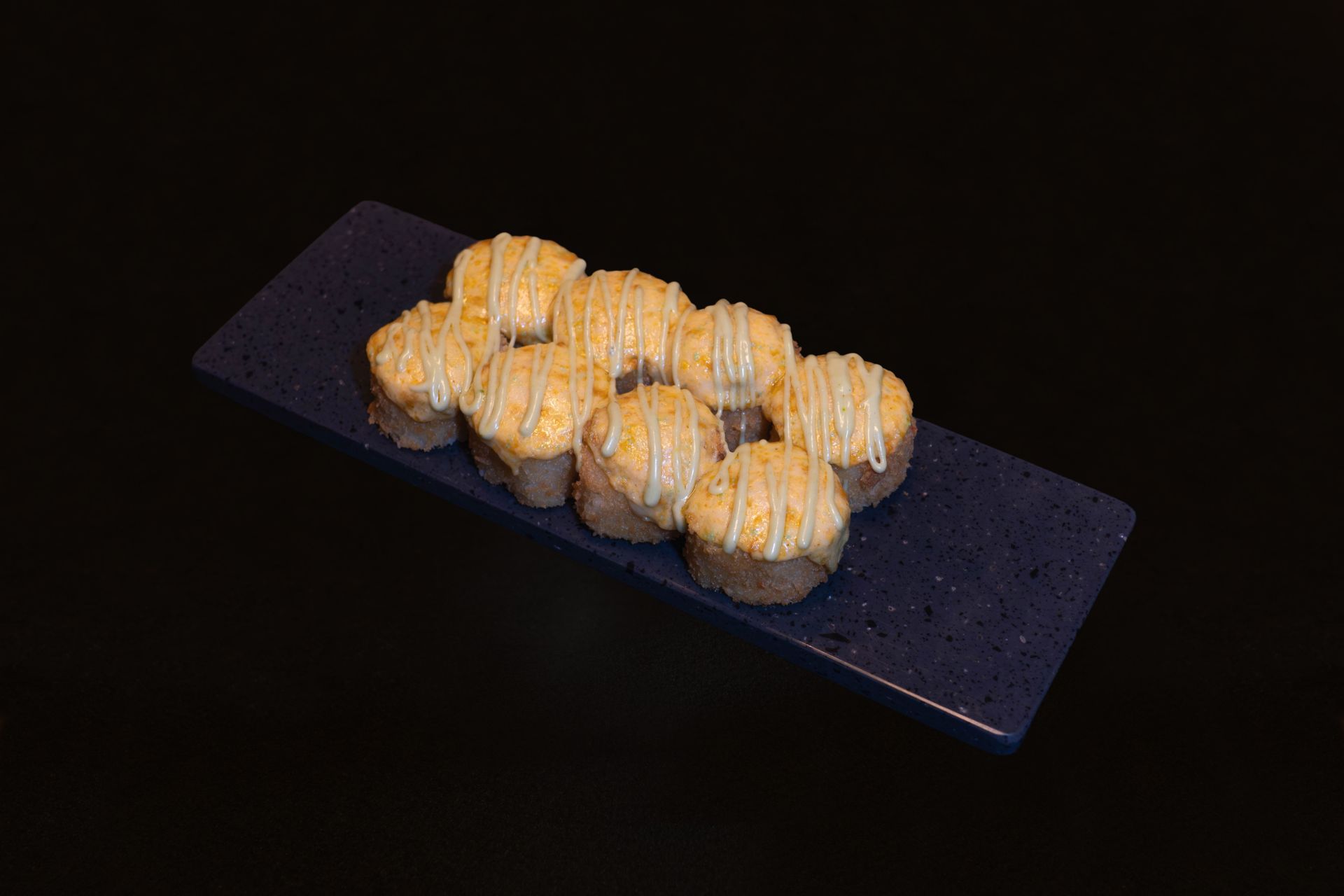 Обжаренный в панировке ролл с обжаренной сёмгой, творожным сыром и огурцом, запечённый под фирменным сырным соусом и политый соусом васаби